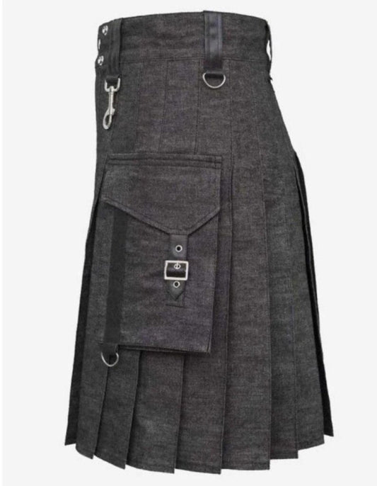 Gothic Denim Utility Kilt: Heavy Scottish Style with Straps
