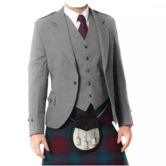 Scottish Men’s Grey Blazer Wool Argyle Kilt Jacket With Vest