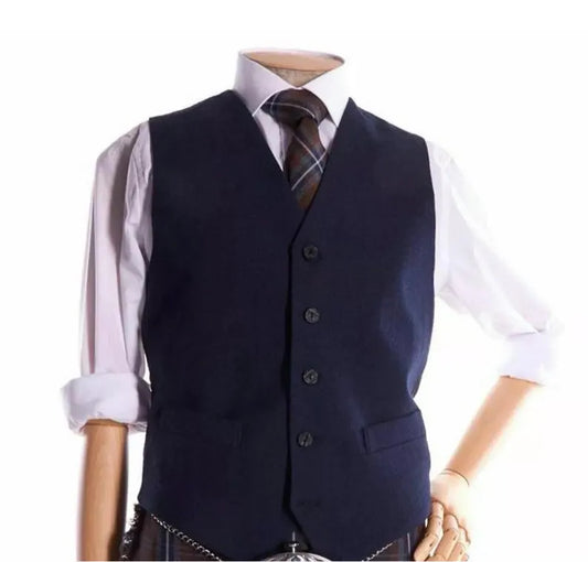 Scottish Men’s Navy Blue Argyle Wool Kilt With Vest Wedding Jacket
