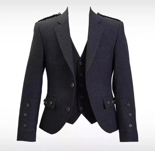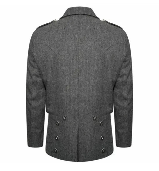 Scottish Men’s Gray Prince Charlie Tweed Jacket With WaistCoat Wedding Kilt Jacket
