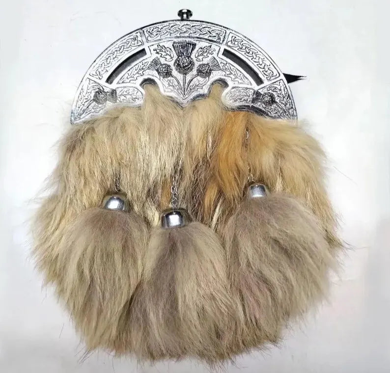 Expertly handcrafted from genuine brown fox fur and finished with a durable real-leather back, this sporran showcases rich natural texture and long-lasting strength. An antique-finish Celtic cantle and classic tassels highlight the heritage design, while the included adjustable chain belt ensures a secure, comfortable fit for any kilt.