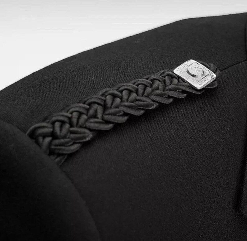 Tailored from luxury black wool, the Argyle jacket features notch lapels, gauntlet cuffs, and traditional silver Celtic buttons, while the coordinated five-button waistcoat (vest) adds a refined layered finish. Designed for a custom fit and lasting comfort, it pairs perfectly with any tartan kilt or Highland formal accessories.
