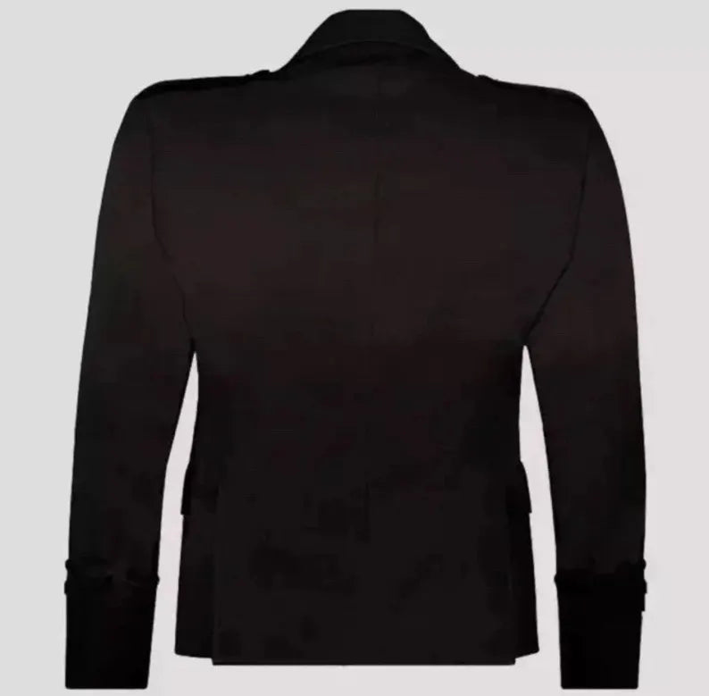 Expertly handcrafted from premium black wool, the coat features the traditional Argyle cut with braided epaulettes, gauntlet cuffs, and gleaming chrome buttons, while the matching five-button vest adds a sharp layered finish. Designed for durability and comfort, it pairs flawlessly with any tartan kilt or formal Highland outfit.